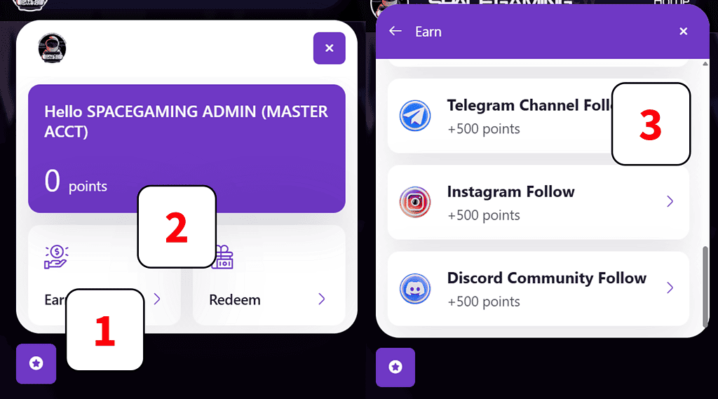 - 👣𝐒𝐭𝐞𝐩 𝟑: You will see a list of SpaceGaming social media which you can follow to earn points!